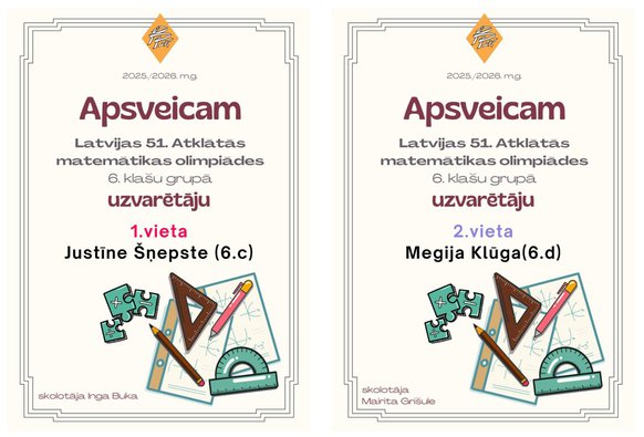 Liels prieks par Justīnes un Megijas sniegumu Latvijas 51. Atklātajā matemātikas olimpiādē, kur 877 dalībnieku konkurencē Justīne Šņepste ieguva 1.vietu, bet Megija Klūga ierindojās 2.vietā - APSVEICAM un NOVĒLAM, lai vēlme risināt sarežģītus uzdevumus aug augumā.