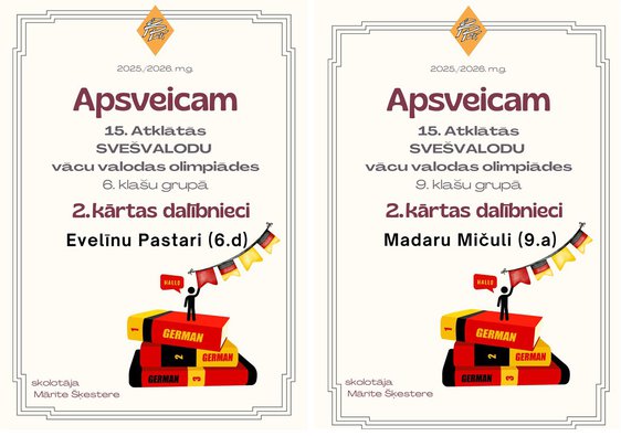 Apsveicam Madaru Mičuli (9.a) un Evelīnu Pastari (6.d) ar lielisku sniegumu Atklātās vācu valodas olimpiādes pirmajā posmā.