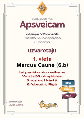 Apsveicam Tevi Marcus Caune ar iegūto 1.vietu (2.posmā) un nokļūšanu Valsts 55. angļu valodas olimpiādes valsts posma 1. kārtā.