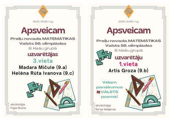 Apsveicam un priecājamies par Madaras Mičules (9.a) un Helēnas Rūtas Ivanovas veikumu MATEMĀTIKAS olimpiādes 2. posmā.